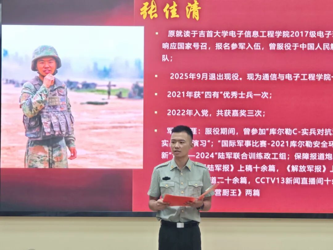 作为吉首大学2025年秋季退役士兵代表,首先,他向母校、师长及战友们致以诚挚谢意。他回顾道,自己最初受电视报道《大年除夕,万家团聚,人民战士上演最美逆袭》感召,萌生参军念头,服役期间,他始终坚持学习、锤炼自我,不仅担任新闻报道员等职务,还斩获多项荣誉,并于2022年光荣入党。