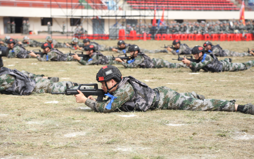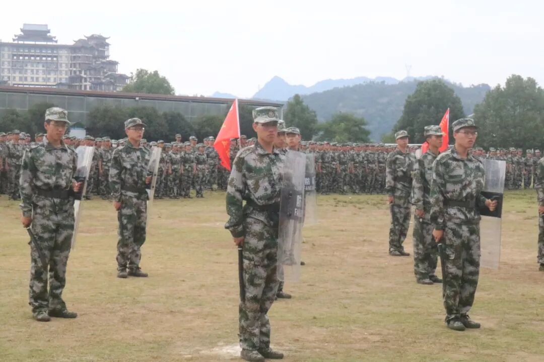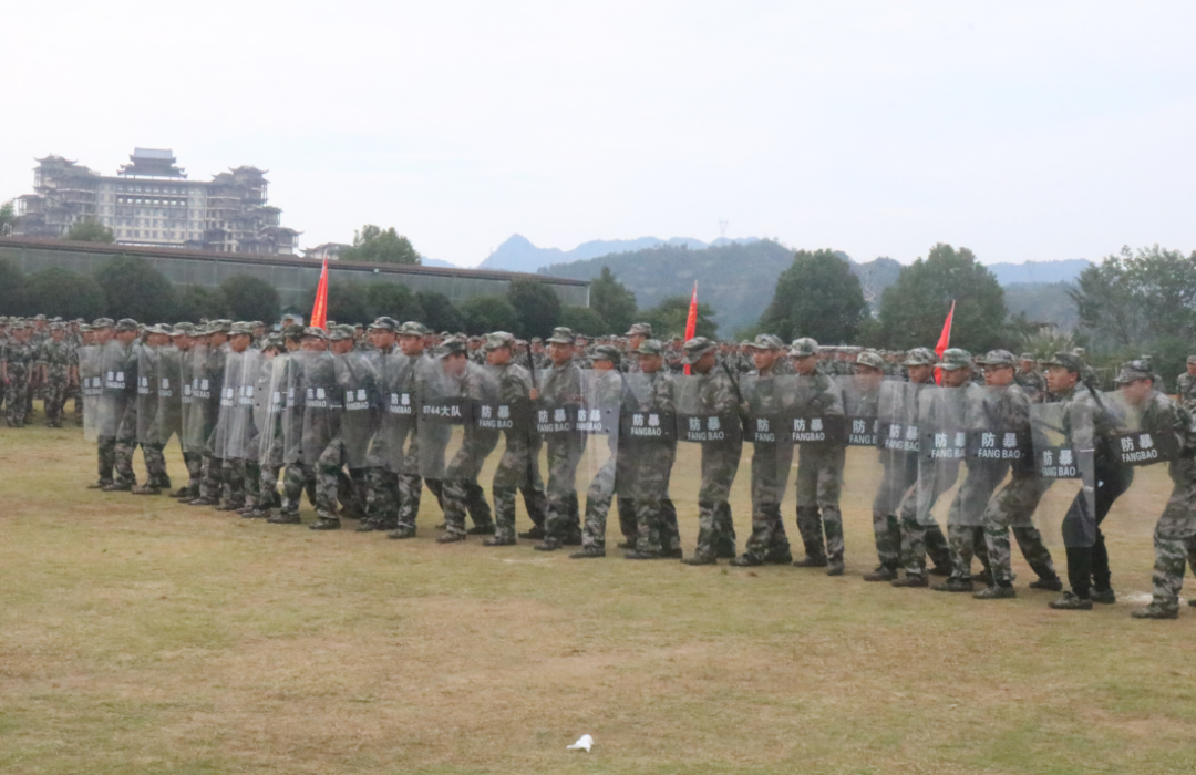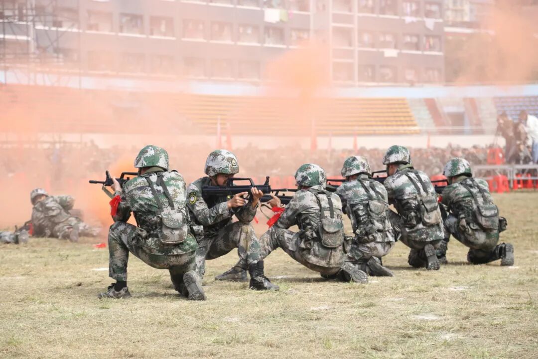 分列式、警棍盾牌操、匕首操、刺杀操、擒敌拳方阵轮番上演,方阵队形变幻莫测,节奏整齐划一。他们身姿挺拔,突、刺、防、击,动作娴熟,喝声阵阵,豪情满怀。擒敌拳表演中,擒拿格斗摔腾空,气贯山河武带风,同学们迅猛出拳,虎虎生威。