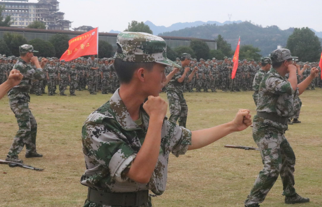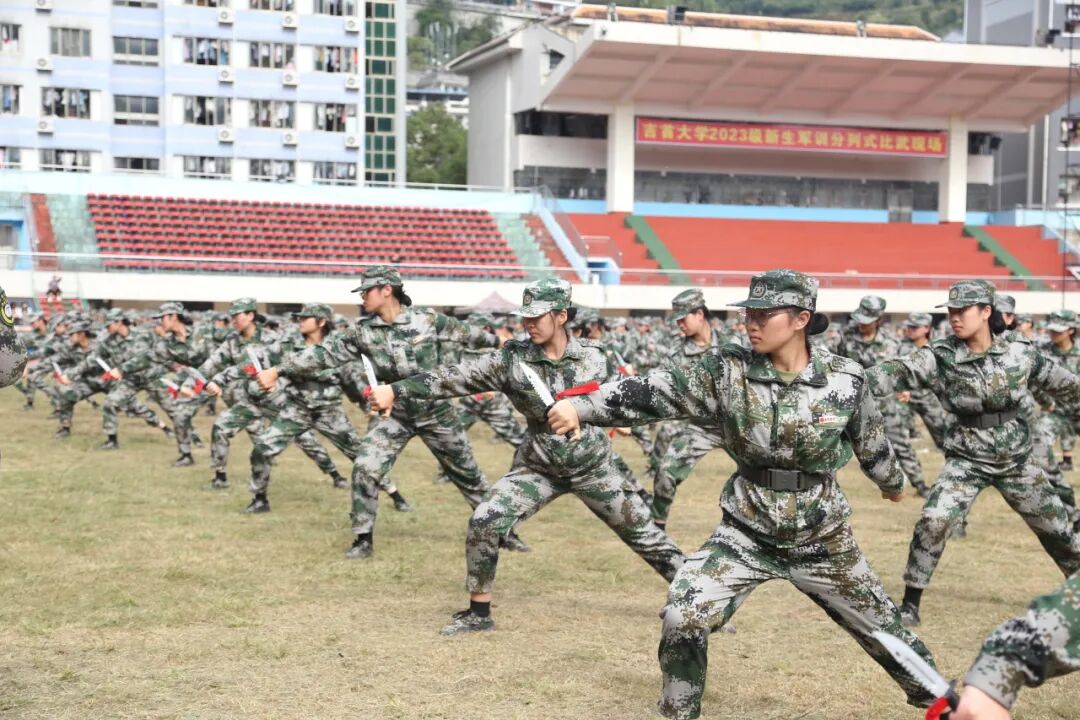 来自音乐舞蹈学院的77名2023级新生带来军歌表演《把青春压进枪膛》,歌声铿锵有力,舞姿迅捷生动,引得满场喝彩。来自文学与新闻传播学院新生朗诵团的80名同学为大家带来朗诵《吉大新青年》,他们慷慨激昂地吟诵着中华民族百年来争取自由争取解放的光辉斗争历史,在回望历史中深情展望未来。57名体育科学学院新生与军训团教练员共同带来战术及综合演练表演,滑行卧倒、举枪“射击”、滚地扫射、腾空侧踢,特战小队在橘色烟雾中同“不法分子”激烈搏斗,解救人质,多日的汗水汇成今日的精彩演出,一连串的作战姿势让观众大呼过瘾。