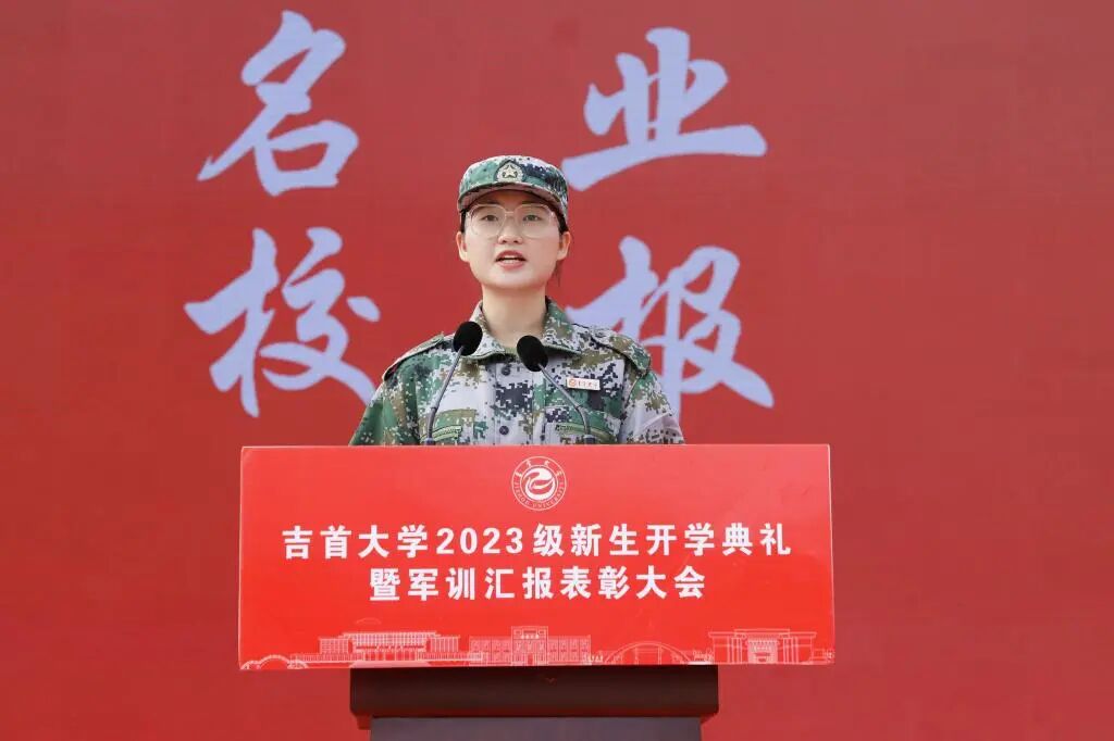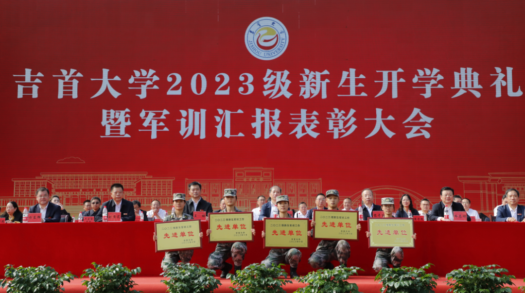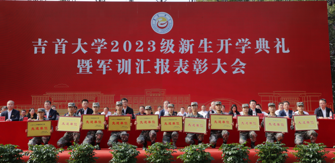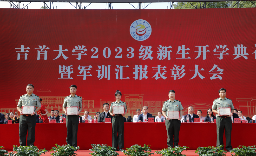 校党委副书记王绯宣读《吉首大学关于对2023级学生军训先进单位和先进个人进行表彰的决定》。经过连排推荐、各营审核、军训团审批,共表彰音乐舞蹈学院等5个军训先进单位,体育科学学院等4个队列优胜单位,商学院等5个格斗基础优胜单位,文学与新闻传播学院等4个内务优胜单位,医学院等4个分列式先进单位,音乐舞蹈学院等4个军歌传唱优胜单位,数学与统计学院等4个朗诵比赛优胜单位,生物资源与环境科学学院等11个2022年征兵工作先进单位,任志君等5位优秀指导员,高小强等52名优秀教练员,冯永康等1080名军训先进个人,王妍等30名医疗救护尖兵,汤淞皓等30名叠被子先进个人,何鑫洋等37名“爱我国防”演讲比赛优胜个人。与会领导、嘉宾为获奖的先进单位和个人进行了颁奖。