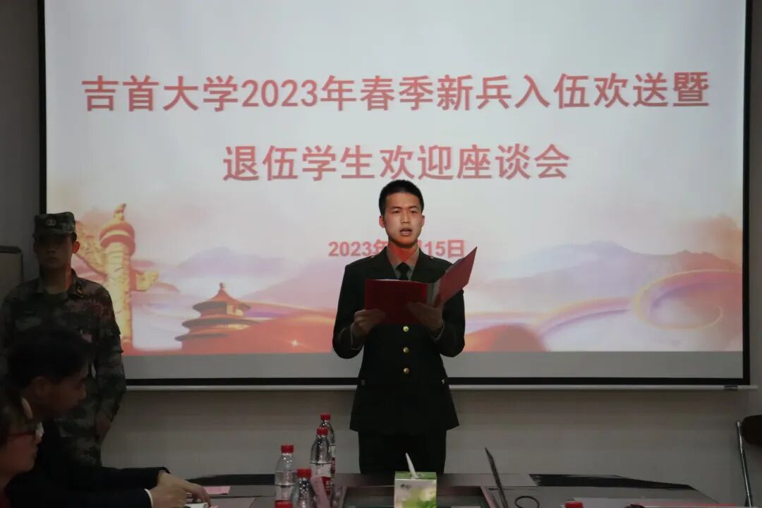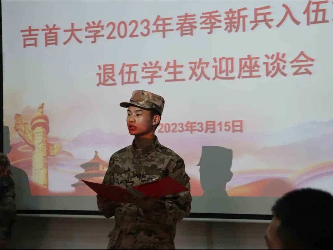 3月15日14:30,吉首大学2023年春季新兵入伍欢送暨退伍学生欢迎座谈会在吉首大学砂子坳校区凤凰楼一楼校办二会议室成功举行。老兵归来,新兵出征。他们在此传递守护的接力棒。