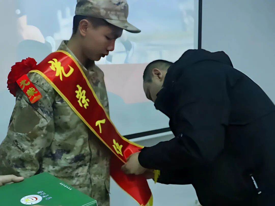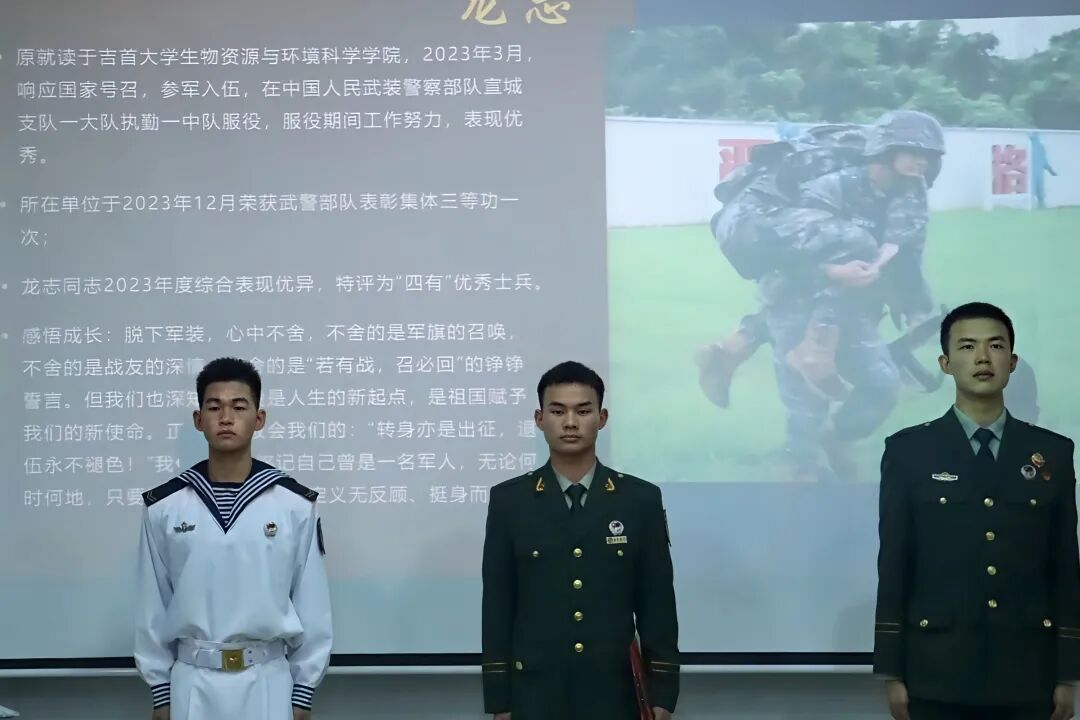 退伍学生龙志说:两年前,我代表入伍新兵在此发言,两年后的今天,很荣幸代表退役士兵发言。感恩母校、老师与战友。在军营的两年里,我们摸爬滚打、并肩作战,这段经历刻骨铭心,如今虽不舍离开,但深知退役是新起点。未来,复学的我们承诺传承红色基因、扎实学习、心系家国。我在此庄严承诺:“军装虽卸,军魂永驻,定会在人生新征程续写荣光!”
