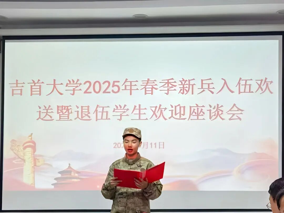 3月11日下午吉首大学2025年春季新兵入伍欢送暨退伍学生欢迎座谈会在吉首大学砂子坳校区凤凰楼一楼校办二会议室成功举行。老兵带着满身荣光载誉归来,新兵怀着满腔热血奔赴征途,在这一刻,守护的重任完成交接。