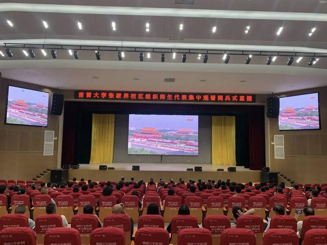 本网讯(通讯员 刘欣然 聂聪 米仁豪)9月3日上午纪念中国人民抗日战争暨世界反法西斯战争胜利80周年大会在北京天安门广场隆重举行我校在吉首砂子坳校区、雷公井校区和张家界校区同步组织师生集中观看直播盛况,全体在校校党政领导、中层干部、师生代表共千余人参加。通过观看阅兵直播,师生共同接受了一场深刻的爱国主义精神洗礼。